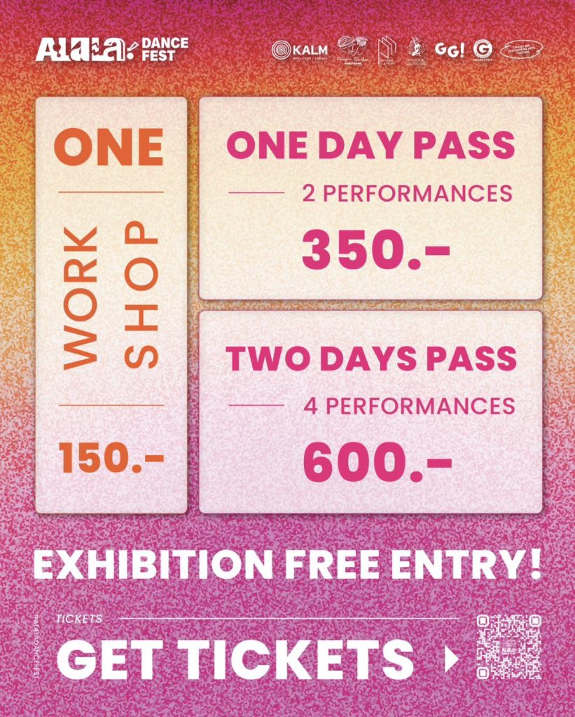สำหรับผู้สนใจเข้าร่วม เทศกาล ALaLa Dance Fest 2025 ได้เปิดจำหน่ายบัตรเข้าชมในหลายรูปแบบ ได้แก่ บัตรวันเดียว ชมการแสดง 2 รอบ ราคา 350 บาท, บัตรสองวัน ชมการแสดง 4 รอบ ราคา 600 บาท และบัตรเข้าร่วมเวิร์กชอป ราคา 150 บาท โดยสามารถจองบัตรเข้าชมได้ที่ https://forms.gle/PQta3pUFvoBETRM58 และจองเวิร์กชอปได้ที่ https://forms.gle/f6qomFa5CRh7HRda9