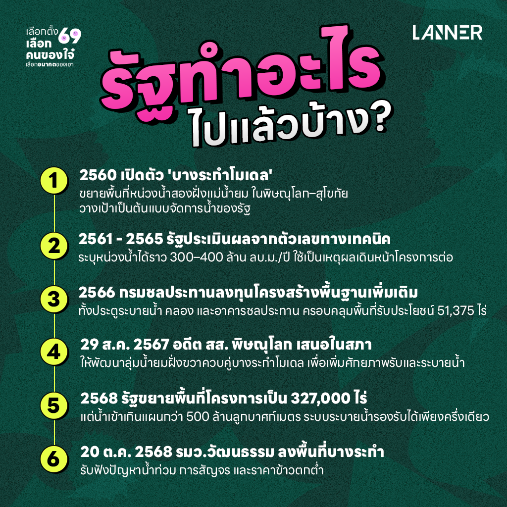 ส่วนในปี 2568 รัฐขยายพื้นที่บางระกำโมเดลเพิ่มเป็น 327,000 ไร่ เพื่อรองรับการจัดการน้ำและการเพาะปลูกข้าวนาปี แต่ในทางปฏิบัติ ปริมาณน้ำที่ไหลเข้าโครงการยังคงสูงเกินแผน เพราะปริมาณน้ำทะลุไปกว่า 500 ล้านลูกบาศก์เมตร ทว่าแม้นาข้าวส่วนหนึ่งจะไม่ได้รับความเสียหายจากการปรับปฏิทินเพาะปลูก แต่ระบบระบายน้ำที่รัฐทำข้อตกลงไว้ ก็ยังรองรับปริมาณน้ำได้เพียงครึ่งหนึ่งของมวลน้ำจริงเท่านั้น
