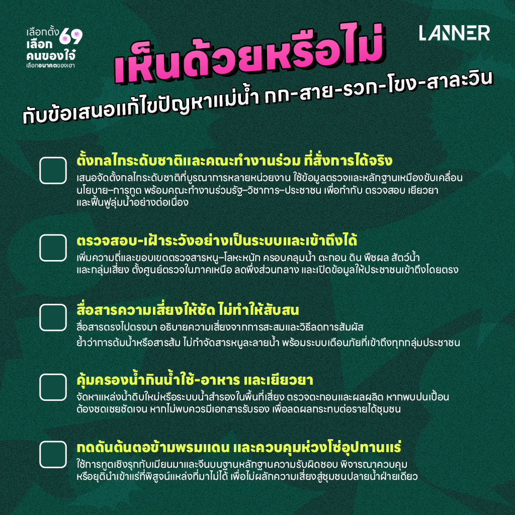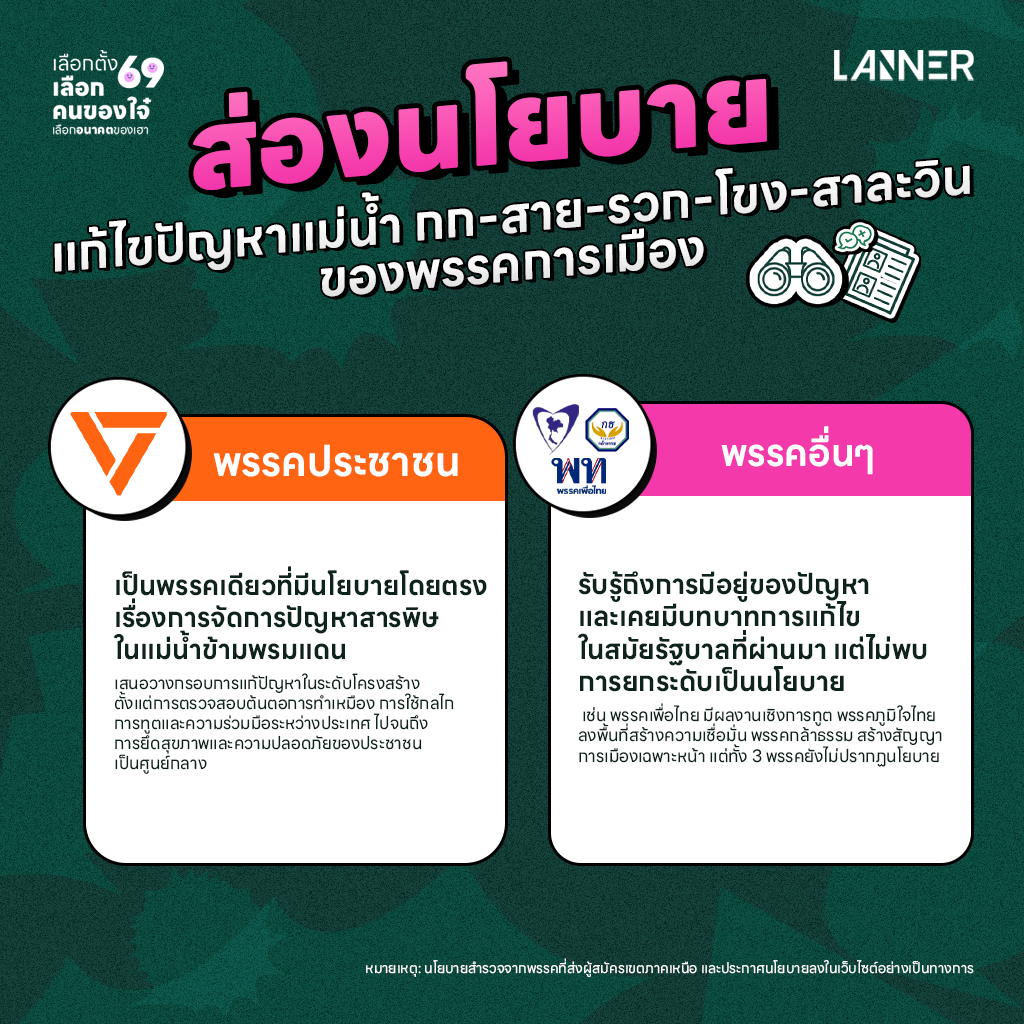 จากการสำรวจนโยบายหลักของพรรคการเมืองที่ส่งผู้สมัครลงแข่งขันในเขตภาคเหนือ ซึ่งประกาศนโยบายลงในเว็บไซต์อย่างเป็นทางการ พบเพียง พรรคประชาชน ที่มีนโยบายอย่างเป็นรูปธรรมว่าจะจัดการกับปัญหาสารพิษในแม่น้ำข้ามพรมแดน ซึ่งเรื่องนี้ สืบสกุล กิจนุกร อาจารย์ประจำสำนักวิชานวัตกรรมสังคม มหาวิทยาลัยแม่ฟ้าหลวง ชี้ว่า นโยบายดังกล่าวพยายามวางกรอบการแก้ปัญหาในระดับโครงสร้าง ตั้งแต่การตรวจสอบต้นตอการทำเหมือง การใช้กลไกการทูตและความร่วมมือระหว่างประเทศ ไปจนถึงการยึดสุขภาพและความปลอดภัยของประชาชนเป็นศูนย์กลาง ทว่าแม้ประชาชนจะเป็นพรรคเดียวที่มีนโยบายชัด แต่โจทย์ใหญ่ยังคงติดอยู่ที่ว่า จะทำยังไงให้คนเห็นและจับต้องได้