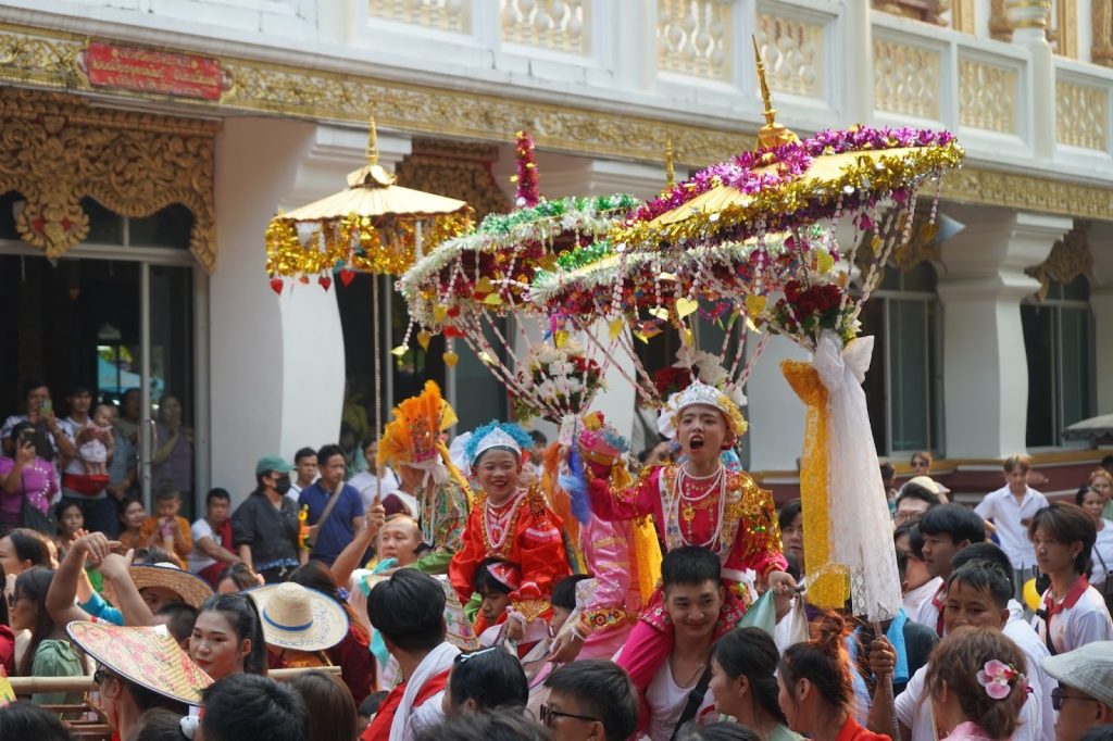 เสียงกลองดังสนั่นสลับกับเสียงฆ้องกังวานก้องไปทั่วลานวัด จังหวะเร่งขึ้นพร้อมกับขบวนส่างลองที่เคลื่อนตัวอย่างช้าๆ ผู้คนใส่ชุดหลากสี เด็กชายในชุดสีสดใสถูกอุ้มขึ้นขี่คอเหนือฝูงชน ใบหน้าถูกแต่งแต้มอย่างประณีต