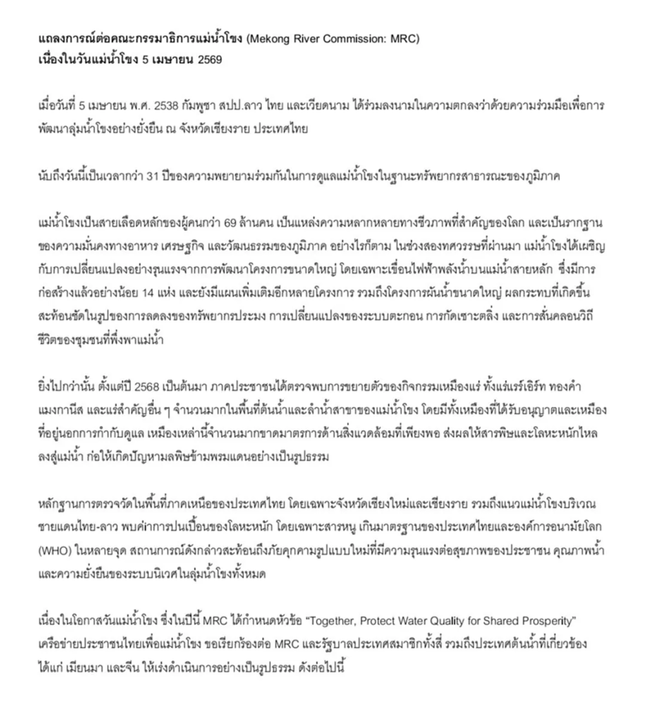 5 เมษายน 2569 เนื่องในวันครบรอบ 31 ปี การร่วมลงนามในความตกลงว่าด้วยความร่วมมือเพื่อการพัฒนาลุ่มน้ำโขงอย่างยั่งยืน ณ จังหวัดเชียงราย เครือข่ายประชาชนไทยเพื่อแม่น้ำโขง (Thai People’s Network for the Mekong) และองค์กรภาคีจากหลายภาคส่วน ออกแถลงการณ์ถึง Mekong River Commission หรือ MRC เรียกร้องให้ประเทศสมาชิกเร่งดำเนินมาตรการแก้ไขปัญหาคุณภาพน้ำและสารพิษข้ามพรมแดนอย่างเป็นรูปธรรม