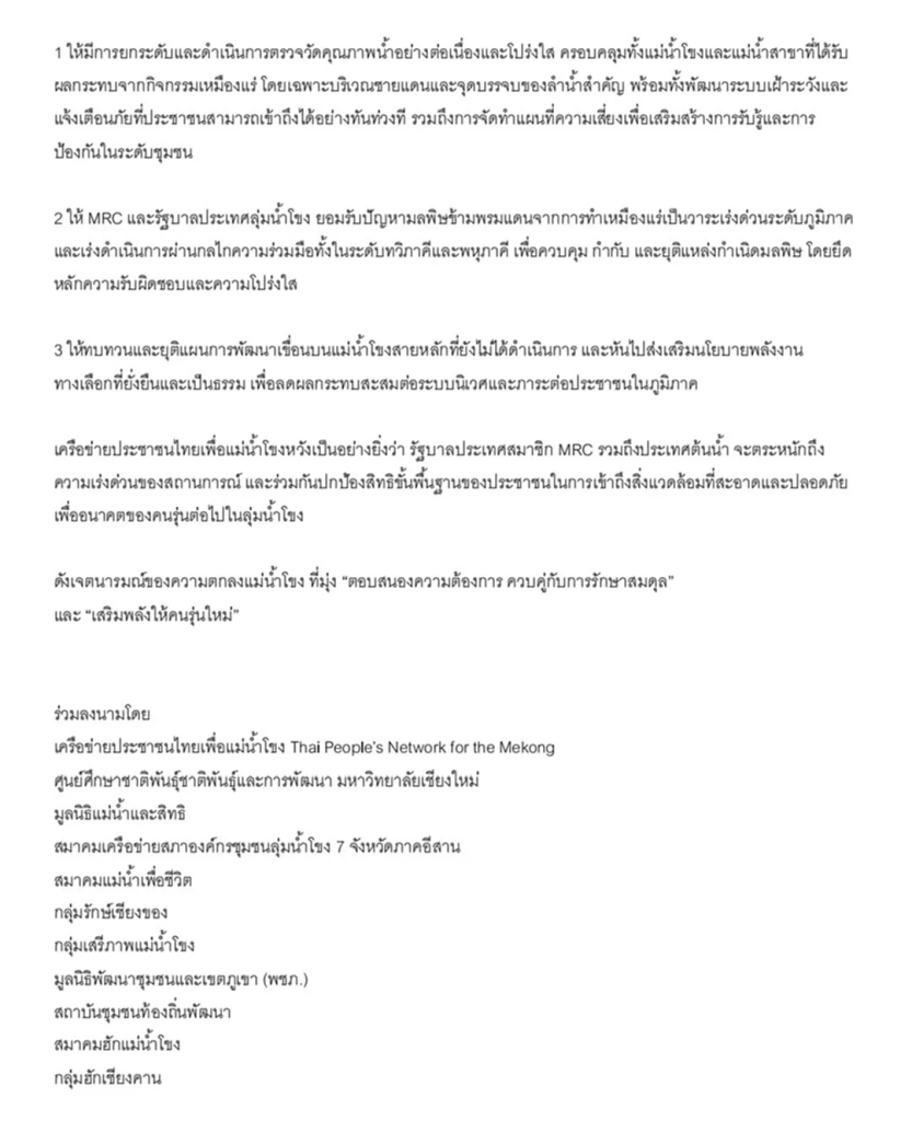 2. ให้ MRC และรัฐบาลประเทศลุ่มน้ำโขง ยอมรับปัญหามลพิษข้ามพรมแดนจากการทำเหมืองแร่เป็นวาระเร่งด่วนระดับภูมิภาค และเร่งดำเนินการผ่านกลไกความร่วมมือทั้งในระดับทวิภาคีและพหุภาคี เพื่อควบคุม กำกับ และยุติแหล่งกำเนิดมลพิษ โดยยึดหลักความรับผิดชอบและความโปร่งใส