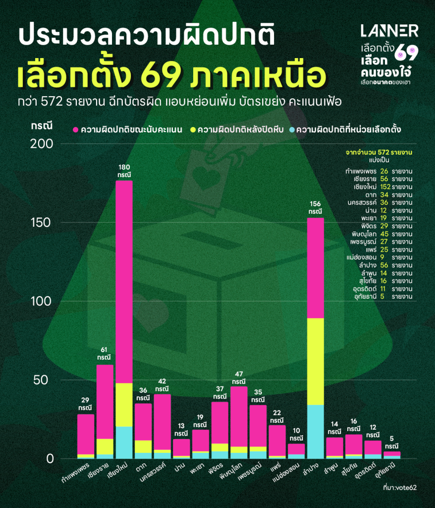 เบื้องต้น พบรายงานความผิดปกติทั้งภาคเหนือ รวม 572 รายงาน จาก 445 หน่วย แบ่งเป็น ความผิดปกติที่หน่วยเลือกตั้ง 99 กรณี | ความผิดปกติหลังปิดหีบ 123 กรณี | ความผิดปกติขณะนับคะแนน 512 กรณี ซึ่งสามารถจำแนกรายจังหวัดได้เป็น