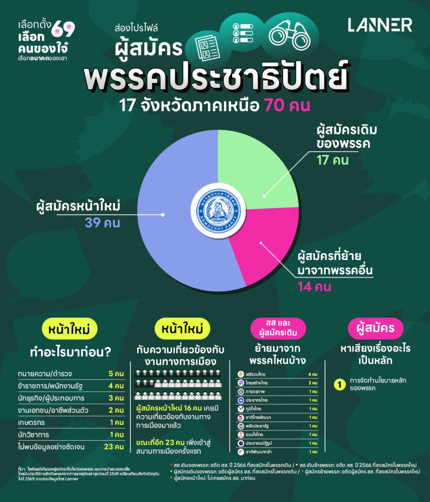 อ่าน [ชุดข้อมูล] เปิดข้อมูลผู้สมัคร สส. 17 จังหวัดภาคเหนือ จาก 70 เขต–33 พรรค–558 คน https://www.lannernews.com/11012569-01/