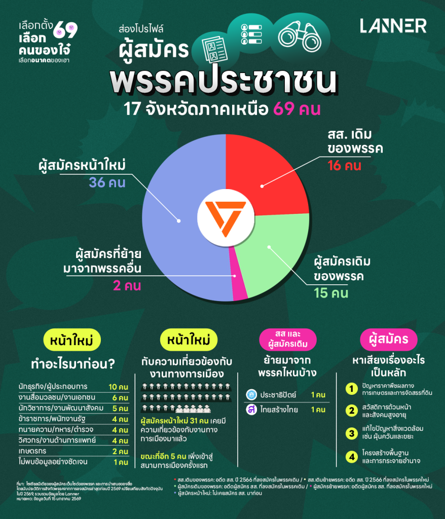 ในการเลือกตั้งปี 2569 พรรคประชาชนส่งผู้สมัครภาคเหนือรวม 69 เขต เพราะไม่มีผู้สมัครในพื้นที่ตาก เขต 2 แต่จากผู้สมัครทั้งหมด 69 คน สามารถจำแนกออกเป็น 1. สส.เดิมของพรรค 16 คน 2. ผู้สมัครเดิมของพรรค 15 คน 3. ผู้สมัครที่ย้ายมาจากพรรคอื่น 2 คน และ 4. ผู้สมัครหน้าใหม่ 36 คน