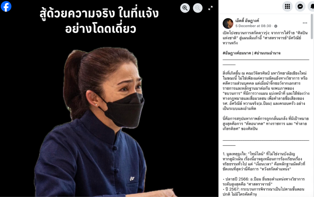 ขณะเดียวกัน ฝ่ายผู้ถูกกล่าวหาและผู้สนับสนุนได้ออกมาโต้แย้งว่า กรณีดังกล่าวไม่ใช่เพียงข้อพิพาททางวิชาการ แต่เป็นความพยายาม ‘กลั่นแกล้งอย่างเป็นระบบ’ ภายในคณะวิจิตรศิลป์ มหาวิทยาลัยเชียงใหม่
