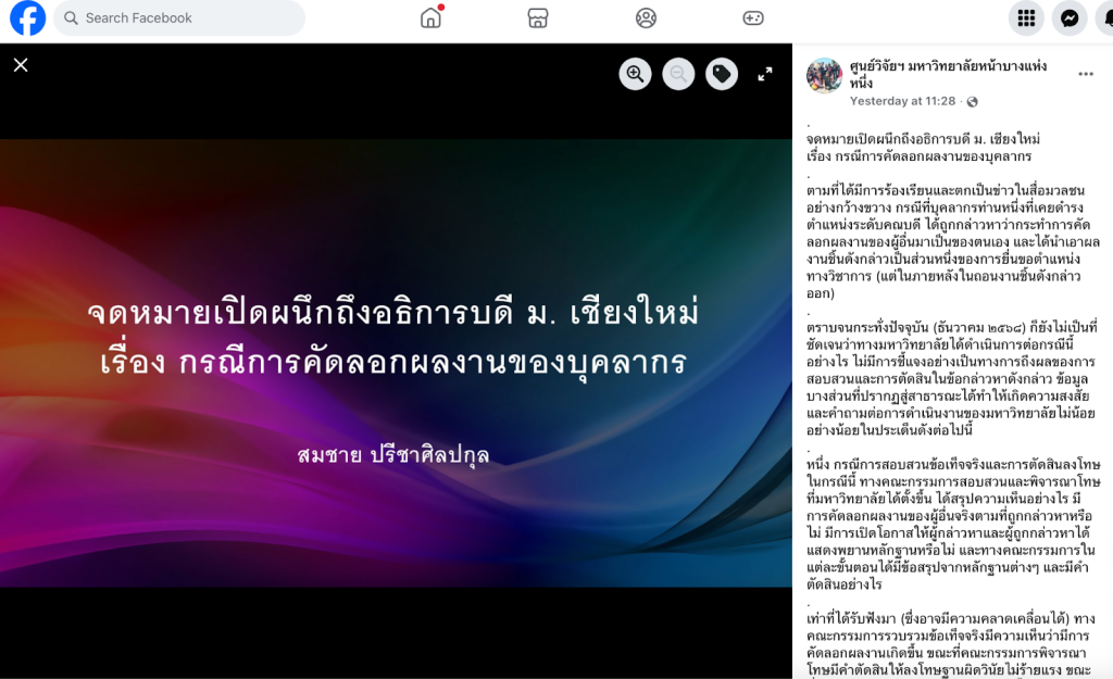 ต่อมา เมื่อวันที่ 11 ธันวาคม 2568 ศาสตราจารย์สมชาย ปรีชาศิลปกุล อาจารย์ประจำคณะนิติศาสตร์ มหาวิทยาลัยเชียงใหม่ ได้เผยแพร่จดหมายเปิดผนึกถึงอธิการบดีมหาวิทยาลัยเชียงใหม่ เรียกร้องให้มหาวิทยาลัยชี้แจงความคืบหน้า กระบวนการสอบสวน และผลการพิจารณาในกรณีดังกล่าวอย่างชัดเจนต่อสาธารณะ