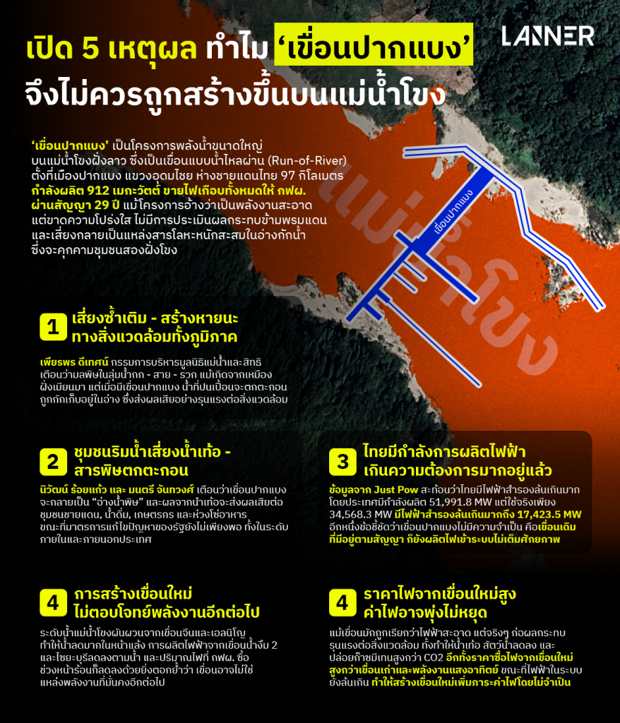 แม้โครงการถูกโปรโมตว่าเป็นพลังงานสะอาด แต่กลับขาดความโปร่งใส ไม่มีการประเมินผลกระทบข้ามพรมแดนและเชิงสะสม อีกทั้งมีความเสี่ยงสารโลหะหนักจากลุ่มน้ำกก–สาย–รวก สะสมในอ่างกักน้ำเป็น ‘อ่างตะกอนพิษ’ คุกคามชุมชนสองฝั่งโขง