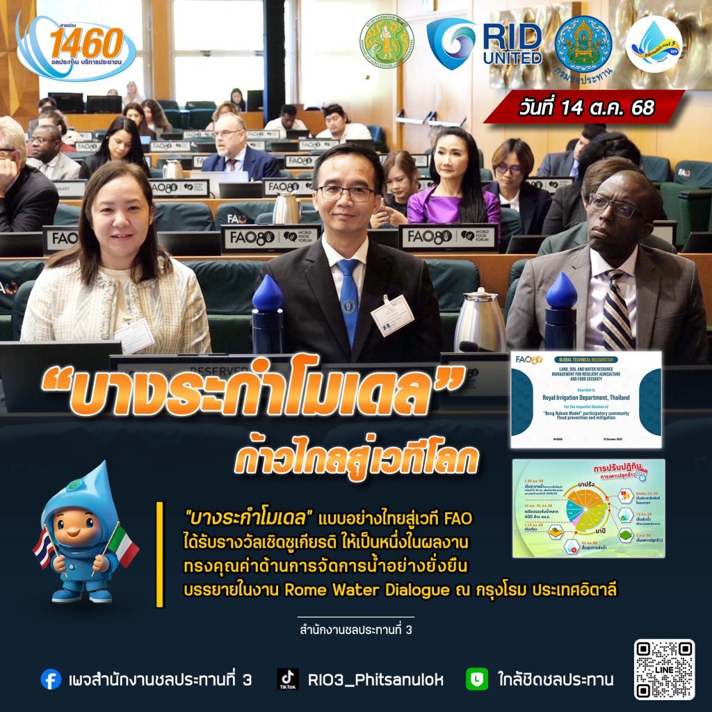 ‘บางระกำโมเดล’ โครงการบริหารจัดการน้ำโดยชุมชน ภายใต้สำนักงานชลประทานที่ 3 ได้รับรางวัล Impactful Solution จากองค์การอาหารและเกษตรแห่งสหประชาชาติ (FAO) ในงาน Rome Water Dialogue ณ กรุงโรม ประเทศอิตาลี เนื่องในโอกาสครบรอบ 80 ปี FAO