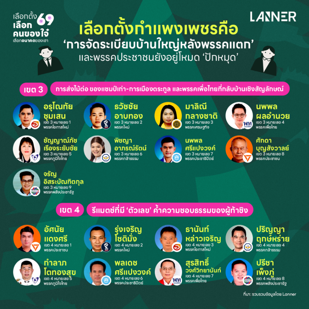 สามารถดู [ชุดข้อมูล] ผู้สมัคร สส. 17 จังหวัดภาคเหนือ จาก 70 เขต–33 พรรค–558 คน ทั้งหมดได้ที่ https://www.lannernews.com/11012569-01/