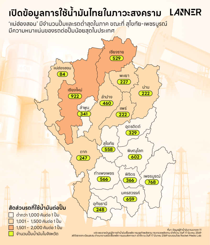 ข้อมูลจาก Rocket Media Lab เผยให้เห็นความหนาแน่นของปริมาณปั๊มน้ำมันและรถที่ใช้น้ำมันในแต่ละจังหวัด ซึ่งพบว่า จากข้อมูลผู้ค้าน้ำมันตามมาตรา 11 แห่งพระราชบัญญัติการค้าน้ำมันเชื้อเพลิง กรมธุรกิจพลังงาน กระทรวงพลังงาน ปี 2568 ประเทศไทยมีปั๊มน้ำมันรวม 25,267 แห่ง โดยใน 17 จังหวัดภาคเหนือพบจังหวัดที่มีปั๊มน้ำมันมากที่สุด 3 อันดับแรก ได้แก่ เชียงใหม่ ซึ่งมีปั๊มน้ำมันทั้งหมด 922 แห่ง ตามมาด้วย เพชรบูรณ์ 768 แห่ง และนครสวรรค์ 659 แห่ง ในขณะที่จังหวัดที่มีปั๊มน้ำมันน้อยที่สุด 3 อันดับแรก ได้แก่ แม่ฮ่องสอน จำนวน 84 แห่ง ตามมาด้วย น่านและแพร่ ที่มีจำนวนปั๊มเท่ากัน 222 แห่ง และพะเยา 227 แห่ง