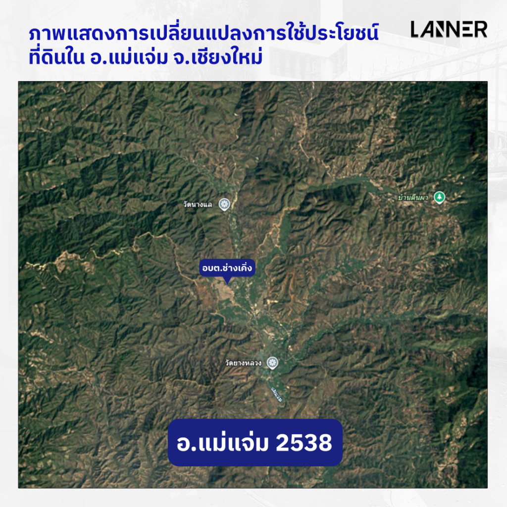 งานวิจัย Effects of landuse change on the hydrologic regime of the Mae Chaem river basin จาก World Agroforestry (ICRAF) ที่ศึกษาการเปลี่ยนแปลงประโยชน์การใช้ที่ดินในลุ่มน้ำแม่แจ่ม ชี้ว่า การถางป่าเพื่อปลูกพืชเชิงพาณิชย์ อย่างเช่น ข้าวโพดเลี้ยงสัตว์ โดยเฉพาะในพื้นที่สูง ทำให้ระดับการคายน้ำของพืชลดลง และน้ำไหลบ่าผิวดินเพิ่มขึ้น เมื่อปริมาณน้ำส่วนเกินไหลลงสู่ลุ่มน้ำด้านล่างมากขึ้น พื้นที่ปลายน้ำ (เช่นตำบลช่างเคิ่ง) จึงมีความเสี่ยงต่อเหตุการณ์น้ำหลากสูงขึ้น แม้ว่างานวิจัยจะไม่ได้ประเมินน้ำป่าโดยตรง แต่ผลสรุปของวิจัยก็แสดงให้เห็นว่าการเปลี่ยนแปลงรูปแบบการใช้ที่ดินทำให้พื้นที่เกิดความเปราะบางต่อผิวดินและน้ำไหลเข้าสู่ชุมชนเร็วขึ้น