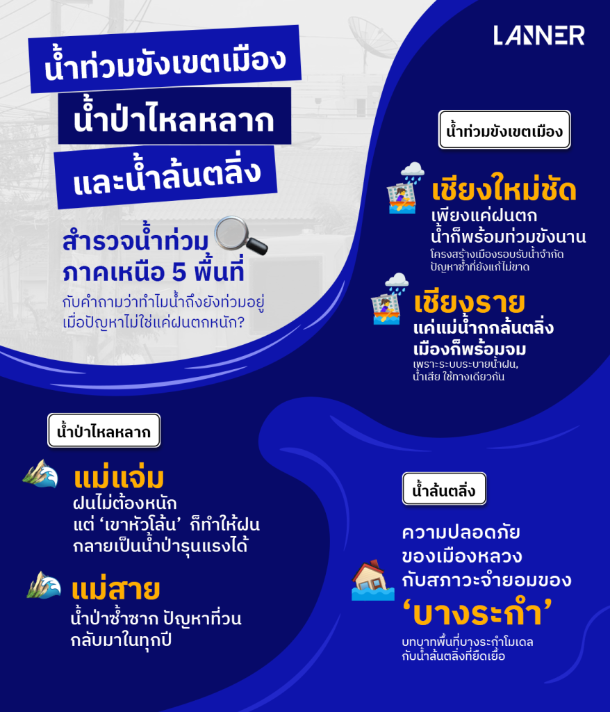 พื้นที่ทั้งสามกลุ่มสะท้อนรูปแบบภูมิศาสตร์และปัจจัยเสี่ยงที่แตกต่างกัน และจะถูกใช้เป็นกรณีศึกษาในการวิเคราะห์ภาพรวมของสถานการณ์น้ำท่วมในภาคเหนือ เพื่อทำความเข้าใจปัญหาให้ลึกไปกว่าคำอธิบายว่า ‘น้ำท่วมเพราะฝนตกหนัก’ เท่านั้น