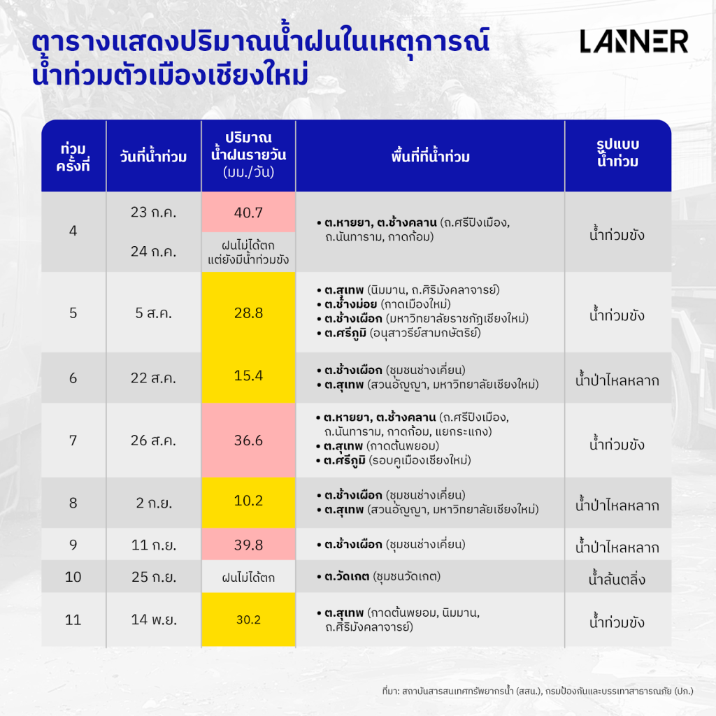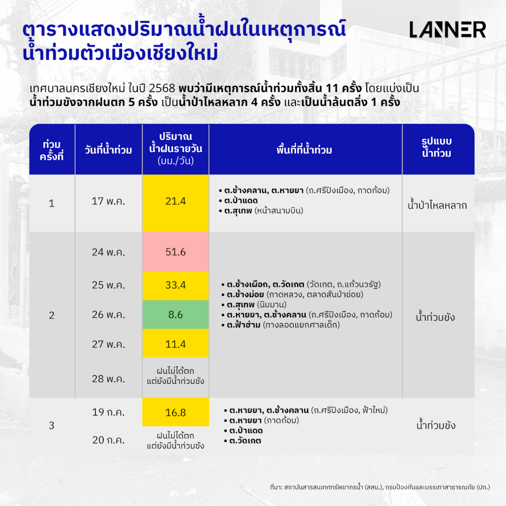 ขณะที่ในกรณีเหตุการณ์น้ำป่าไหลหลาก ตลอดปี 2568 พบเกิดขึ้นทั้งหมด 4 ครั้ง โดยส่วนใหญ่เกิดในพื้นที่ชุมชนช่างเคี่ยนที่ตั้งติดกับเชิงดอยสุเทพ ซึ่งเป็นพื้นที่ที่มีศักภาพในการระบายน้ำต่ำ ทำให้เมื่อเกิดฝนตกหนักบนดอยแม้ในช่วงเวลาสั้น น้ำป่าที่ไหลบ่าลงสู่ชุมชนอย่างรวดเร็ว ผนวกกับปัญหาระบบระบายน้ำที่อุดตัน จึงนำไปสู่ภาวะน้ำท่วมขังตามมาในภายหลัง