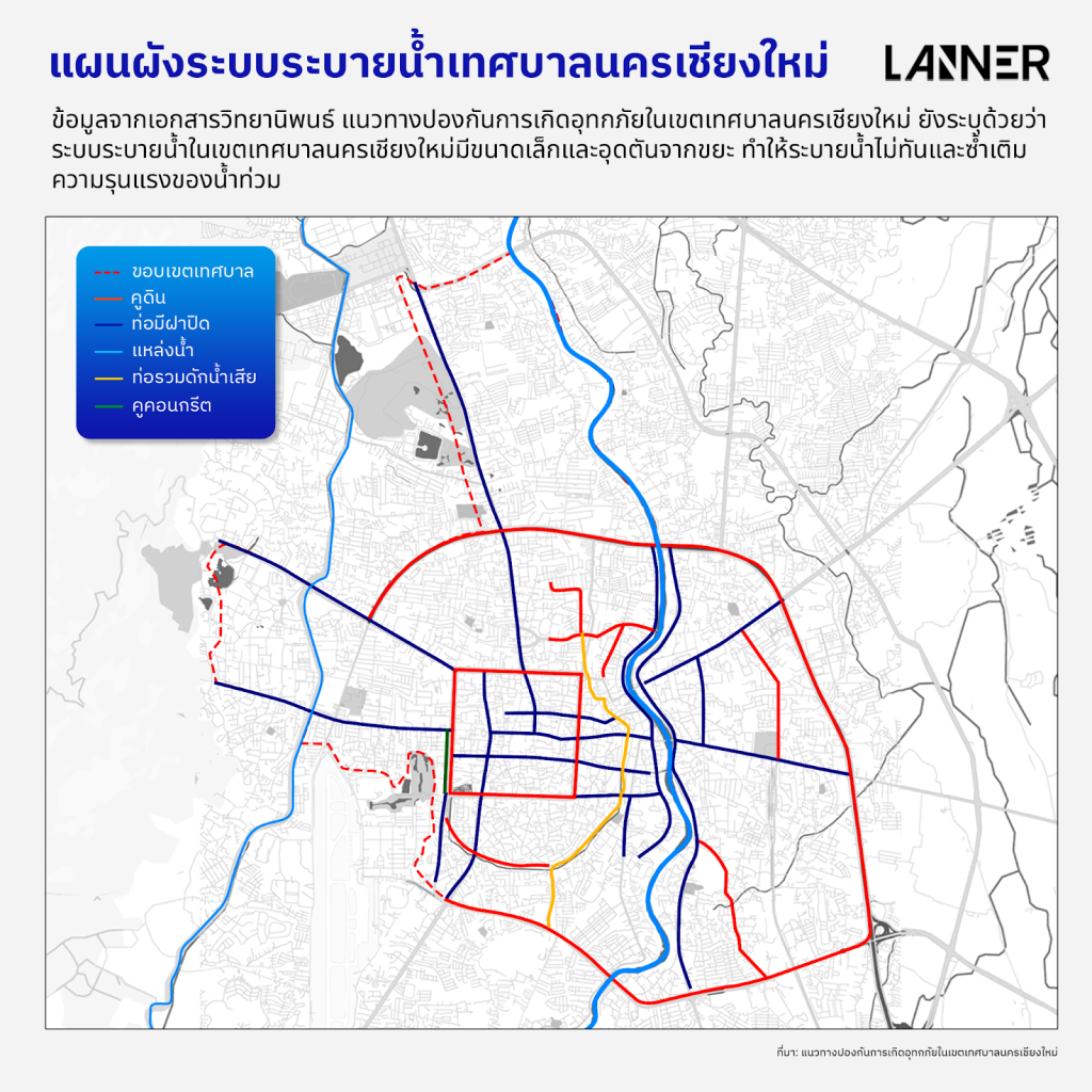 ทั้งนี้ ในเอกสารดังกล่าวยังระบุด้วยว่า แม้ระบบระบายน้ำในเขตเมืองจะไม่ใช่ปัจจัยหลักของการเกิดน้ำท่วม เมื่อเทียบกับปัจจัยอื่น เช่น ปริมาณฝนทั้งในและนอกเขตเมือง การรุกล้ำพื้นที่ริมน้ำ และสภาพแม่น้ำปิงที่ตื้นเขิน แต่ระบบระบายน้ำยังมีบทบาทสำคัญในการเพิ่มความรุนแรงของน้ำท่วม โดยพบว่าท่อและรางระบายน้ำตามถนนหลายสายในเขตเมืองมีขนาดเล็ก และเกิดการอุดตันจากขยะพลาสติก ส่งผลให้การระบายน้ำออกจากผิวจราจรล่าช้าลงเมื่อเกิดฝนตกหนัก