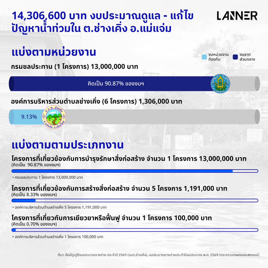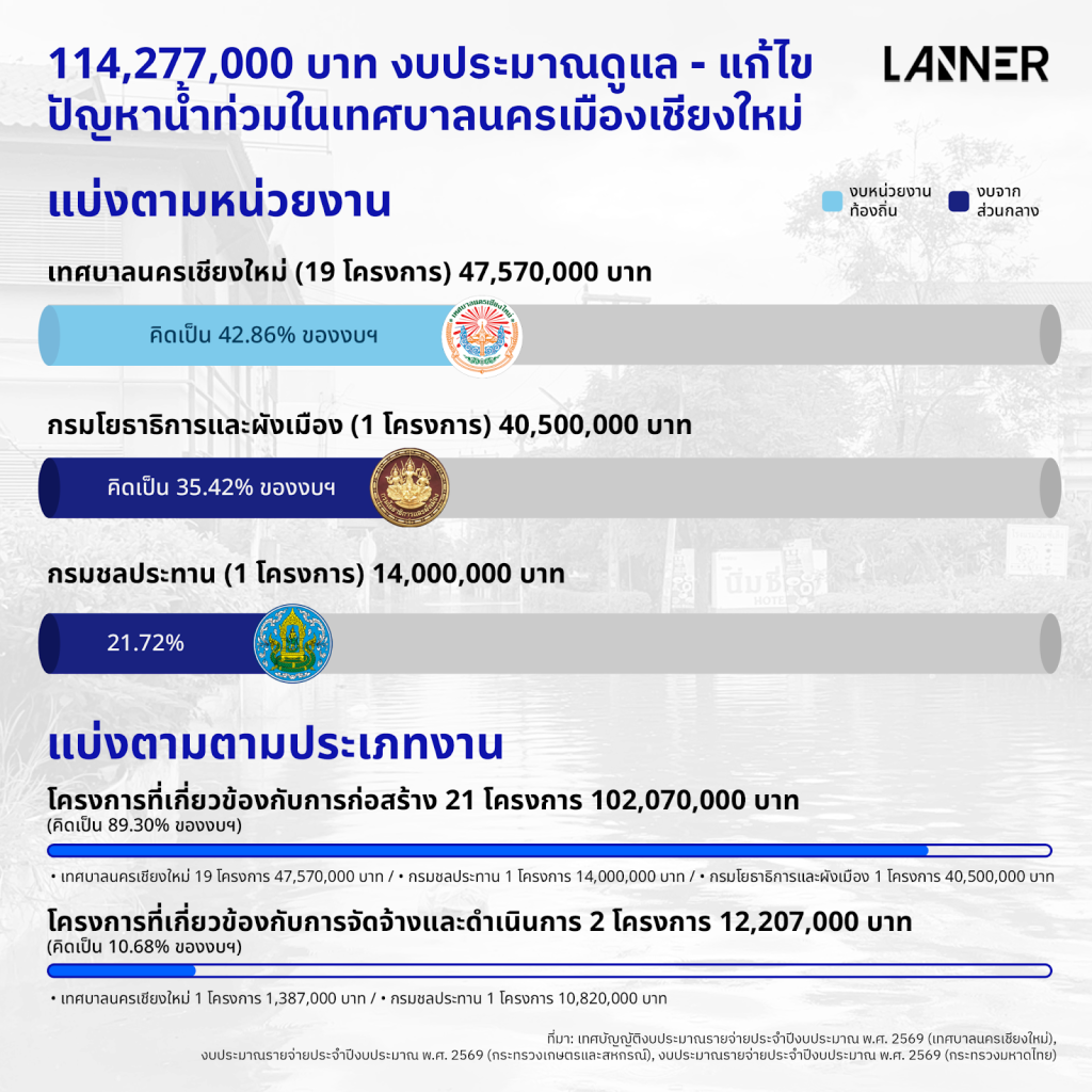 จากเอกสารงบประมาณประจำปี 2569 พบว่าเมืองเชียงใหม่ได้รับงบจัดสรรในการแก้ไขปัญหาน้ำท่วมทั้งสิ้น 114,277,000 บาท แบ่งออกเป็นงบของเทศบาลนครเชียงใหม่ 48,957,000 บาท คิดเป็น 42.86% ของงบฯ ทั้งหมด ส่วนที่เหลือแบ่งเป็นงบกรมโยธาธิการและผังเมือง 40,500,000 บาท คิดเป็น 35.42% ของงบฯ และของกรมชลประทาน 24,820,000 บาท คิดเป็น 21.72% ของงบฯ