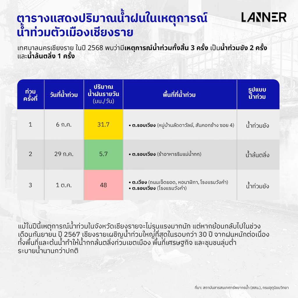 ถัดมาที่เชียงราย พบว่าในปี 2568 เกิดเหตุการณ์น้ำท่วมทั้งสิ้น 3 ครั้ง เป็นน้ำท่วมขัง 2 ครั้ง และน้ำล้นตลิ่ง 1 ครั้ง