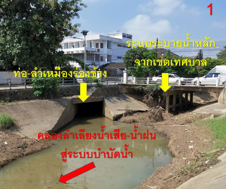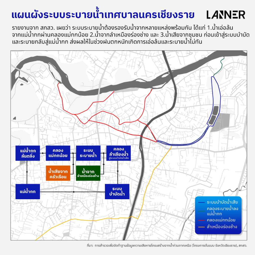 ระบบระบายน้ำในเขตเมืองเชียงรายรับน้ำหลักจากแม่น้ำกก โดยเฉพาะในช่วงที่แม่น้ำกกมีระดับน้ำสูงจนล้นตลิ่ง มวลน้ำหจะไหลเข้าสู่คลองแม่กกน้อย ซึ่งเดิมเป็นคลองที่ชุมชนขุดขึ้นเพื่อผันน้ำจากแม่น้ำกกมาใช้ประโยชน์ ก่อนเข้าสู่ระบบระบายน้ำของเทศบาลเชียงราย ขณะเดียวกัน ระบบเดียวกันนี้ยังรองรับน้ำเสียจากครัวเรือน รวมทั้งน้ำจากลำเหมืองร่องช้าง ส่งผลให้ปริมาณน้ำจำนวนมากต้องไหลผ่านช่องทางเดียวกัน ทำให้เกิดสภาวะคอขวดที่ต้นทางของระบบระบายน้ำ