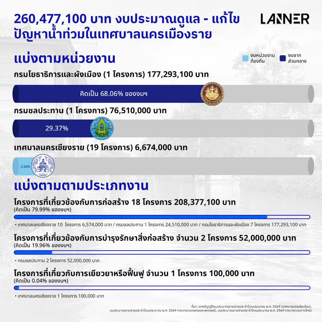 จากเอกสารงบประมาณประจำปี 2569 พบว่าเมืองเชียงรายมีงบประมาณในการดูแลปัญหาน้ำท่วมทั้งสิ้น 260,477,100 บาท หากแบ่งออกตามหน่วยงาน พบว่า เป็นของกรมโยธาธิการและผังเมือง ได้รับงบประมาณ 177,293,100 บาท คิดเป็น 68.06% ของงบฯ เป็นของกรมชลประทาน ได้รับงบประมาณ 76,510,000 บาท คิดเป็น 29.37% ของงบฯ และเป็นของเทศบาลนครเชียงราย ได้รับงบประมาณ 6,674,000 บาท คิดเป็น 2.56% ของงบฯ