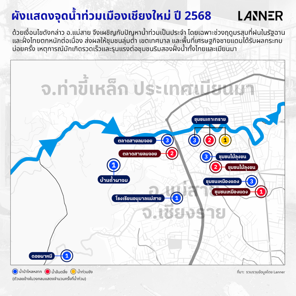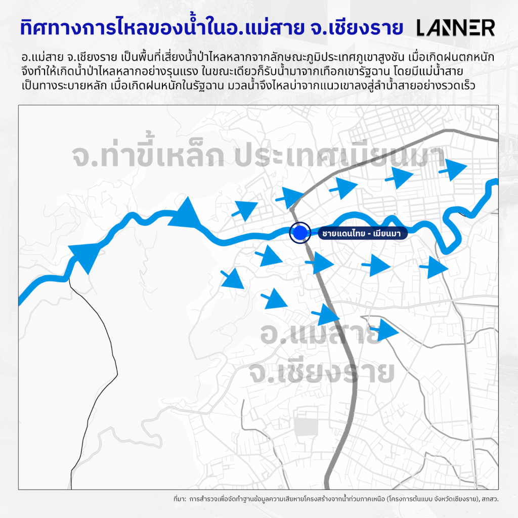 ด้วยเงื่อนไขดังกล่าว อ.แม่สาย จึงเผชิญกับปัญหาน้ำท่วมเป็นประจำ โดยเฉพาะช่วงฤดูมรสุมที่ฝนในรัฐฉานและฝั่งไทยตกหนักต่อเนื่อง ส่งผลให้ชุมชนลุ่มต่ำ เขตเทศบาล และพื้นที่เศรษฐกิจชายแดนได้รับผลกระทบบ่อยครั้ง เหตุการณ์มักเกิดรวดเร็วและรุนแรงต่อชุมชนริมสองฝั่งน้ำทั้งไทยและเมียนมา