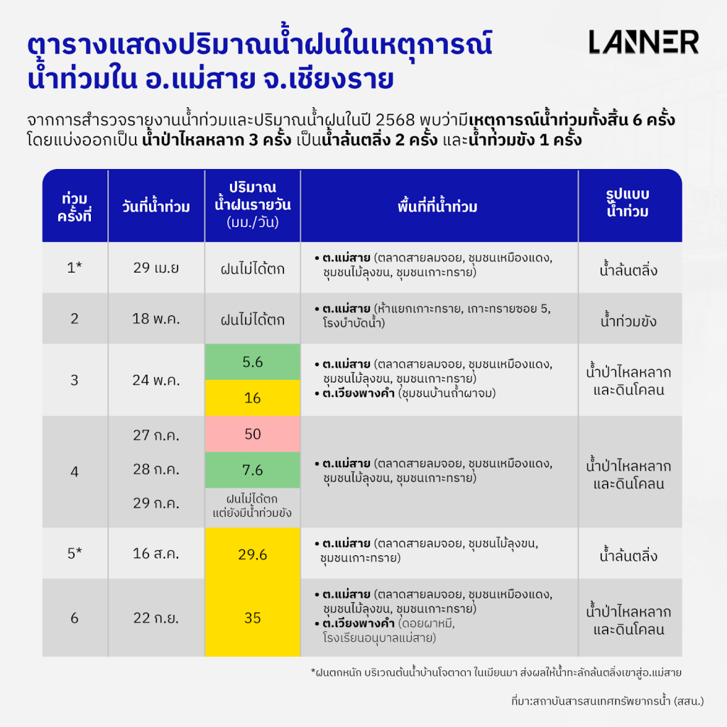 จากการสำรวจรายงานน้ำท่วมและปริมาณน้ำฝนในปี 2568 พบว่ามีเหตุการณ์น้ำท่วมทั้งสิ้น 6 ครั้ง โดยแบ่งออกเป็น น้ำป่าไหลหลาก 3 ครั้ง เป็นน้ำล้นตลิ่ง 2 ครั้ง และน้ำท่วมขัง 1 ครั้ง อย่างไรก็ตามเหตุการณ์น้ำล้นตลิ่ง ทั้ง 2 ครั้งพบว่า ต้นเหตุมาจากฝนตกหนักจนเกิดน้ำป่าไหลหลากในบริเวณ บ้านโจตาดา รัฐฉาน ประเทศเมียนมา ก่อนที่มวลน้ำจะไหลลงแม่น้ำสาย และไหลทะลักเข้าสู่ อ.แม่สาย ในลำดับต่อมา
