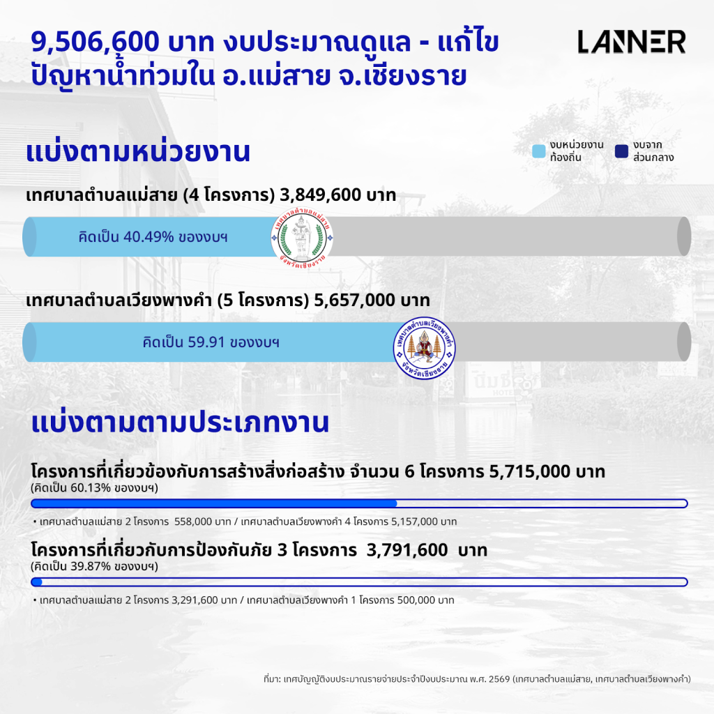 จากเอกสาร เทศบัญญัติ เรื่อง งบประมาณรายจ่าย ประจำปีงบประมาณ พ.ศ.2569 ของเทศบาลตำบลแม่สาย และ เทศบัญญัติงบประมาณรายจ่าย ประจำงบประมาณ พ.ศ.2569 ของเทศบาลตำบลเวียงพางคำ พบว่ามีงบประมาณประจำปีเพียง 9,506,600 บาท โดยแบ่งออกเป็นของ เทศบาลตำบลแม่สาย 3,849,600 บาท คิดเป็น 40.49% ของงบฯ และเป็นของเทศบาลตำบลเวียงพางคำ 5,657,000 บาท คิดเป็น 59.51% ของงบฯ