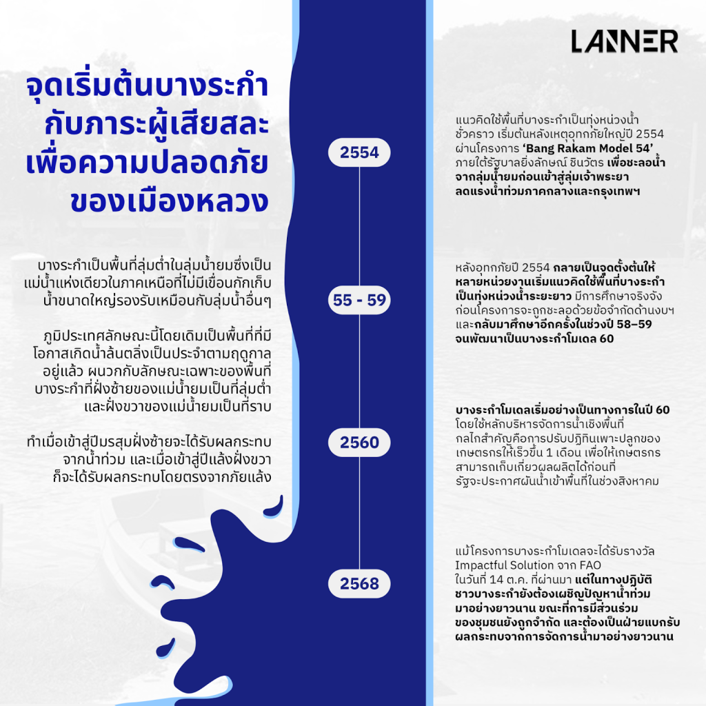 จากการสำรวจข้อมูลระดับน้ำและปริมาณฝนรายวันที่บันทึกในสถานีต่างๆ ภายในพื้นที่บางระกำโมเดลของ Lanner พบว่า เหตุการณ์น้ำท่วมในปีนี้ เริ่มเกิดขึ้นในช่วงต้นเดือนสิงหาคม แม้ช่วงก่อนหน้านั้นอย่างเดือนกรกรฎาคมจะเป็นฤดูฝนเช่นกัน แต่กลับไม่พบสัญญาณน้ำล้นตลิ่งในระดับที่ทำให้เกิดน้ำท่วมพื้นที่การเกษตร
