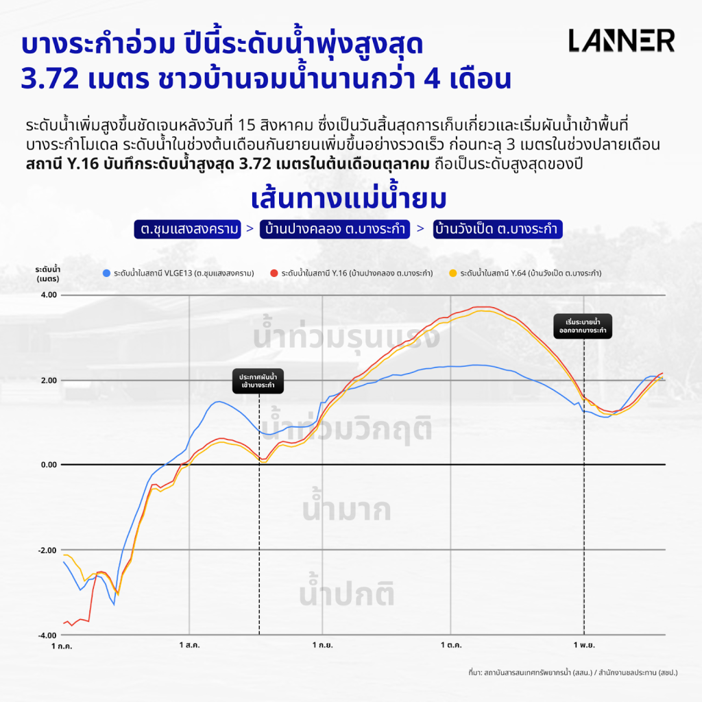 ระดับน้ำพุ่งทะลุไปถึง 3 เมตรในช่วงปลายเดือนกันยายน โดยสถานีวัดระดับน้ำ Y.16 (บ้านปากคลอง ต.บางระกำ) บันทึกระดับน้ำไว้ได้ที่ 3.47 เมตร สูงกว่าระดับสถานี และยังคงเพิ่มต่อเนื่องไปจนถึงช่วงต้นเดือนตุลาคม ซึ่งตรวจพบระดับน้ำสูงสุดมากถึง 3.72 เมตร หรือเกือบ 4 เมตร ถือเป็นช่วงที่พื้นที่รับน้ำมีปริมาณน้ำสูงที่สุดในปีนี้