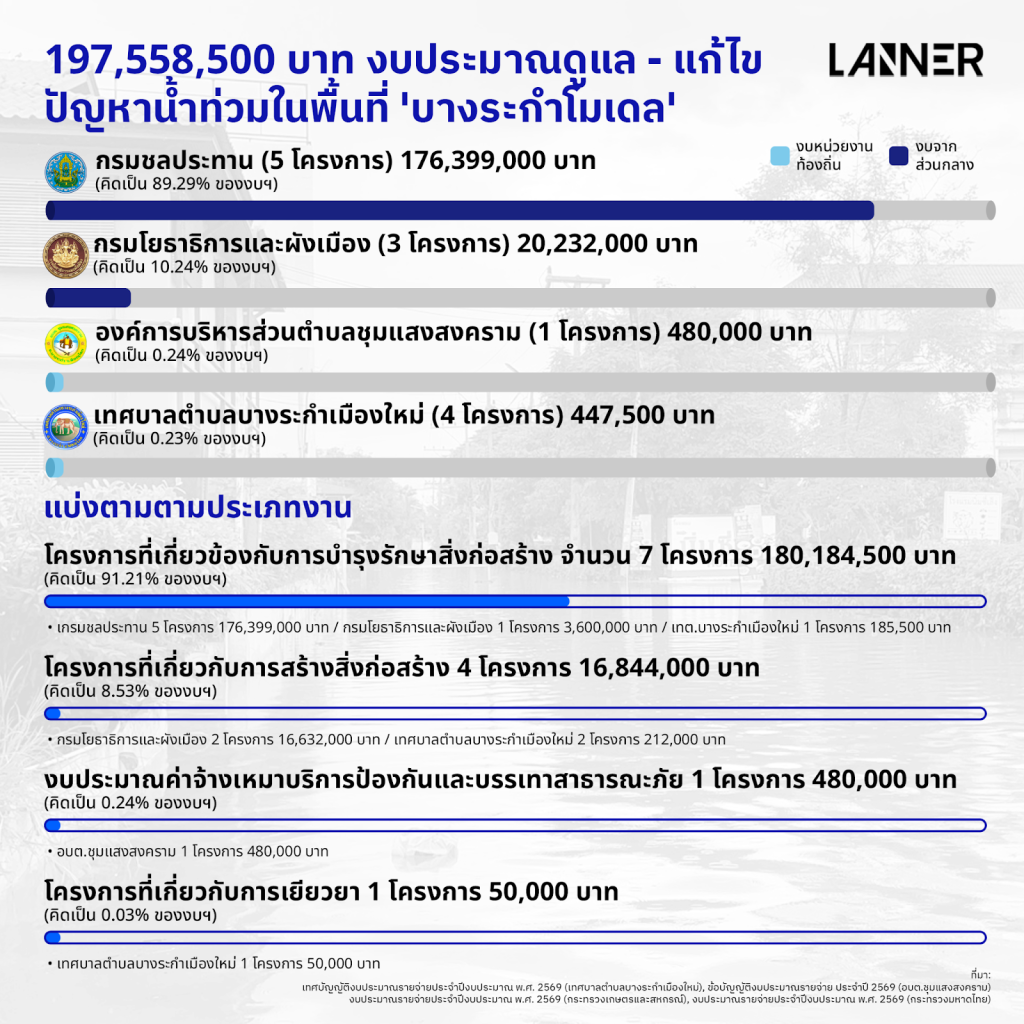จากเอกสารงบประมาณประจำปี 2569 พบว่า อ.บางระกำได้รับงบประมาณจัดสรรในการดูแลปัญหาน้ำท่วมทั้งสิ้น 197,558,500 บาท แบ่งออกเป็น 1.กรมชลประทาน 176,399,000 บาท คิดเป็น 89.29% ของงบฯ 2.กรมโยธาธิการและผังเมือง 20,232,000 บาท คิดเป็น 10.24% ของงบฯ 3.อบต.ชุมแสงสงคราม 480,000 บาท คิดเป็น 0.24% ของงบฯ และ 4.เทศบาลตำบลบางระกำเมืองใหม่ 447,500 บาท คิดเป็น 0.23% ของงบฯ