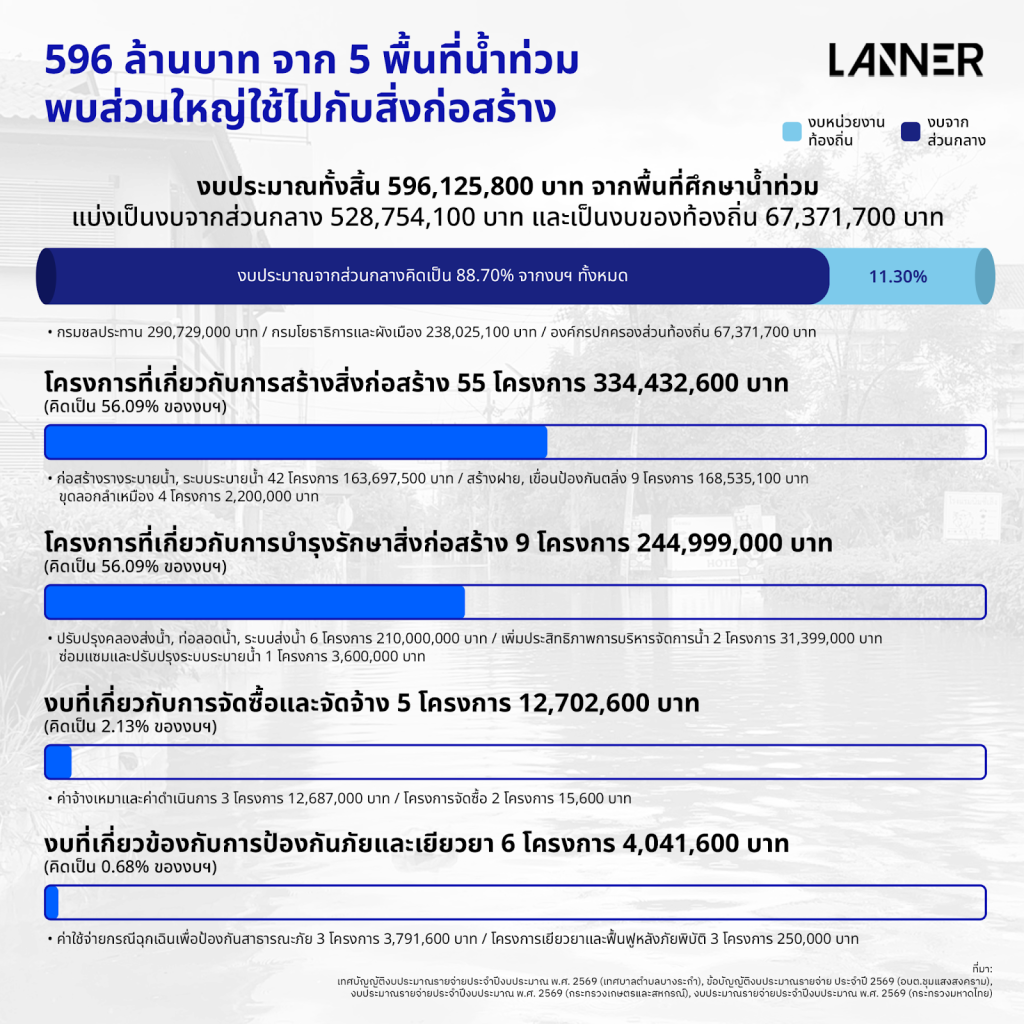 596 ล้านบาท จาก 5 พื้นที่น้ำท่วม พบส่วนใหญ่ใช้ไปกับสิ่งก่อสร้าง