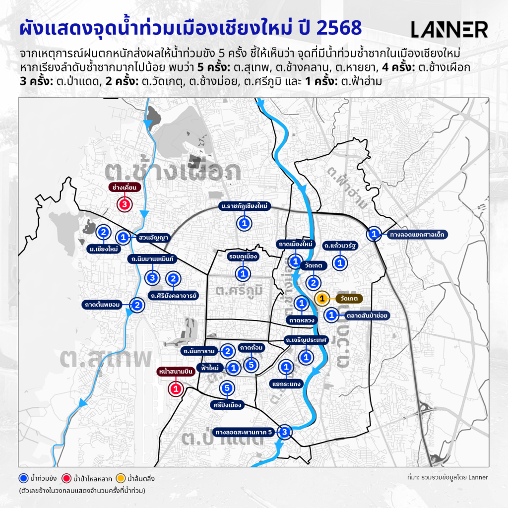 จากเหตุการณ์ฝนตกหนักส่งผลให้น้ำท่วมขัง 5 ครั้ง ชี้ให้เห็นว่าจุดที่มีน้ำท่วมซ้ำซากทุกครั้งในตัวเมืองเชียงใหม่ คือ