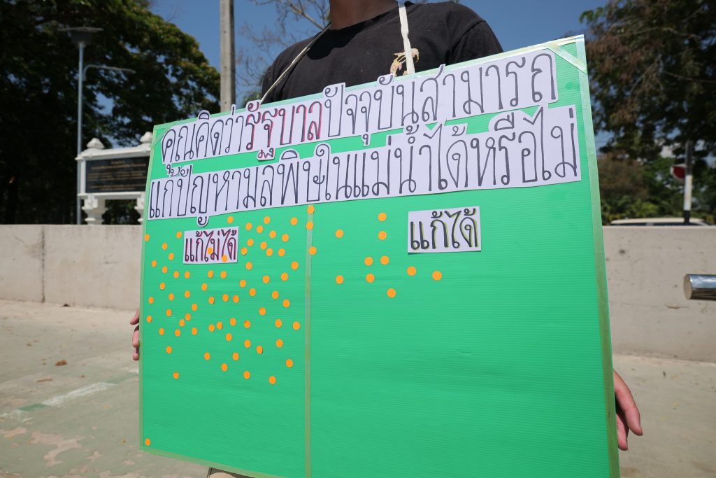 ทั้งนี้ ในช่วงท้ายของกิจกรรมมีโพลสติกเกอร์สำรวจความคิดเห็นของผู้เข้าร่วม ภายใต้คำถามว่า “รัฐบาลปัจจุบันสามารถแก้ปัญหามลพิษในแม่น้ำได้หรือไม่” โดยผู้ว่าราชการจังหวัดเชียงรายได้ร่วมแสดงความเห็น โดยเลือกคำตอบว่า “แก้ไขได้”