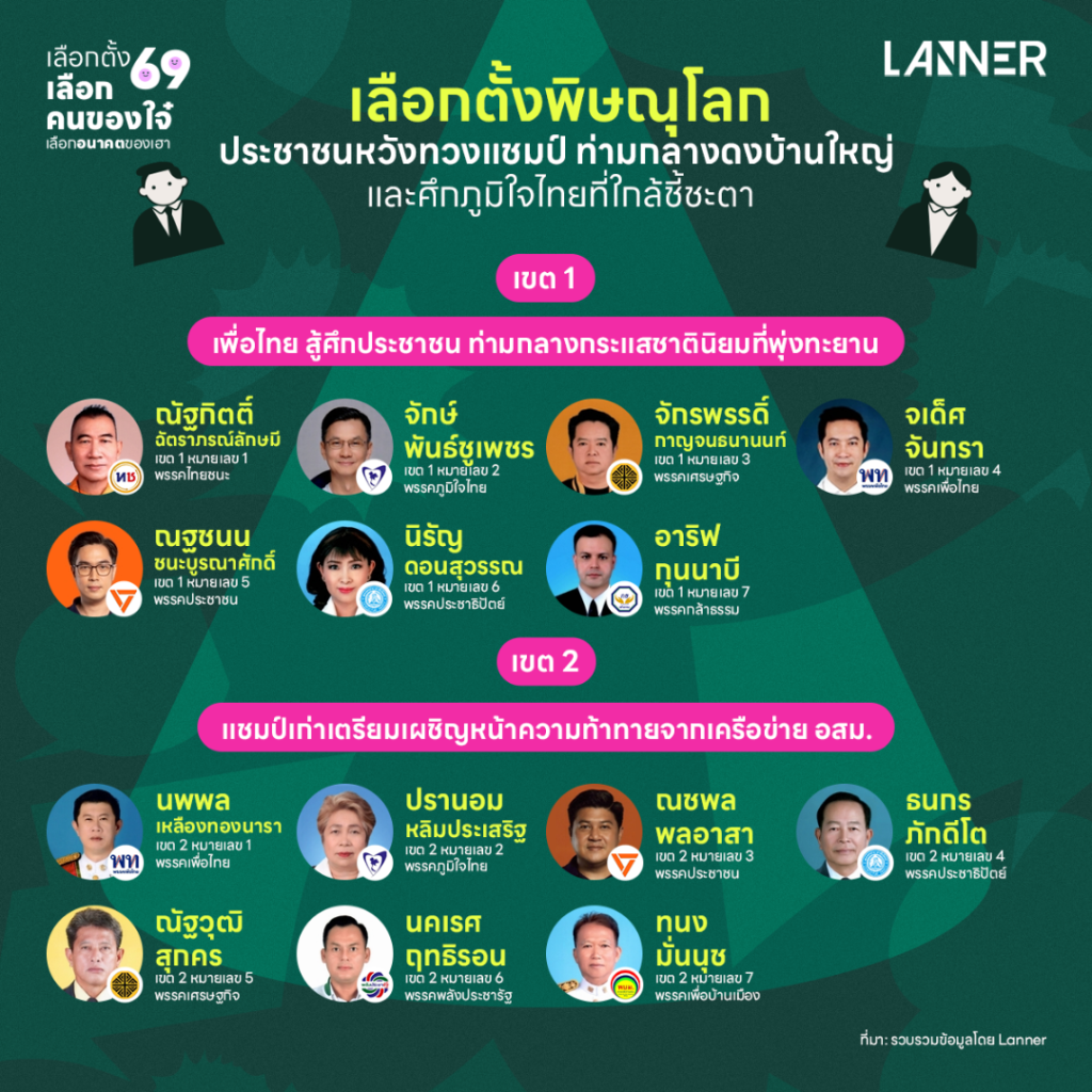 สามารถดู [ชุดข้อมูล] ผู้สมัคร สส. 17 จังหวัดภาคเหนือ จาก 70 เขต–33 พรรค–558 คน ทั้งหมดได้ที่ https://www.lannernews.com/11012569-01/