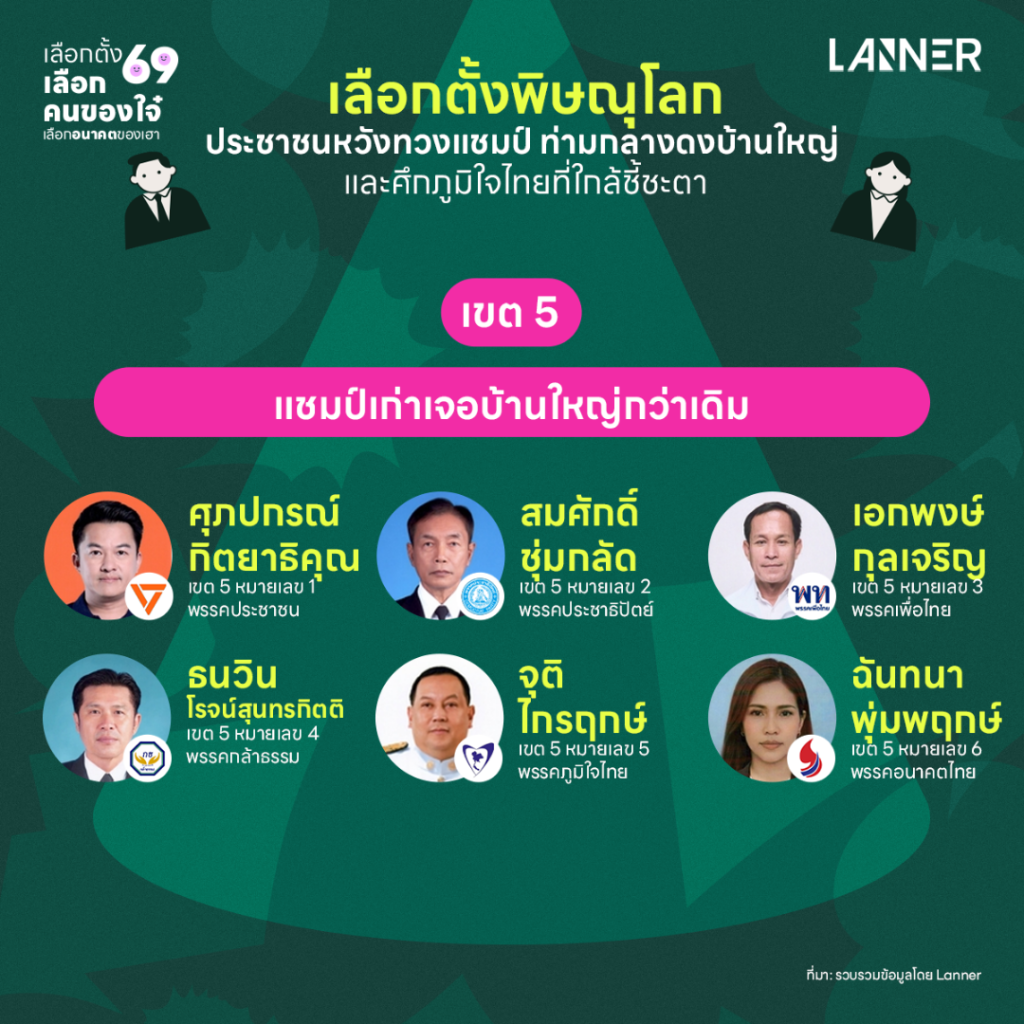 การแข่งขันในเขต 5 จึงเป็นดั่งสนามทดสอบ สส. เขตของพรรคส้ม ว่าจะสามารถรักษาชัยชนะอีกหนได้หรือไม่ เมื่อต้องเผชิญหน้ากับบ้านใหญ่ที่ใหญ่กว่าเดิม