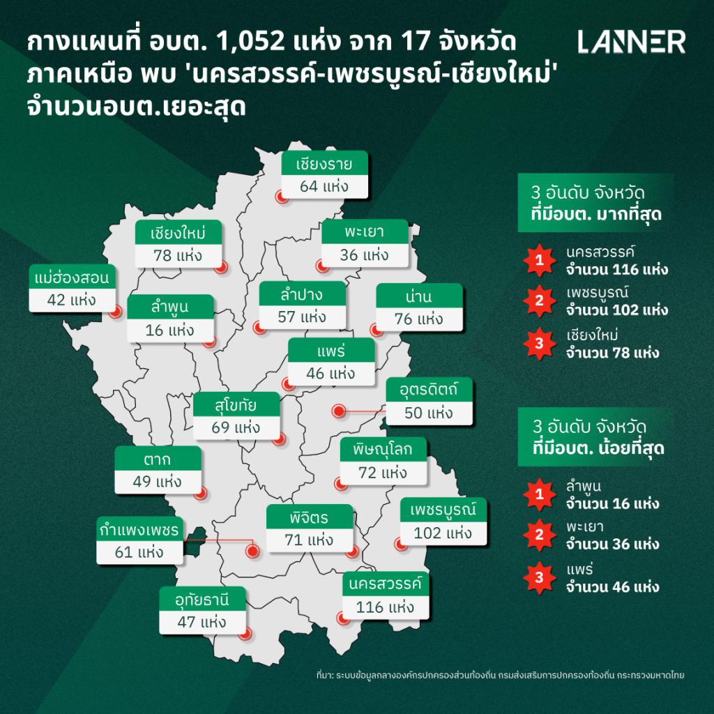 กางแผนที่ อบต. 1,052 แห่ง จาก 17 จังหวัดภาคเหนือ พบ ‘นครสวรรค์-เพชรบูรณ์-เชียงใหม่’ จำนวนอบต.เยอะสุด
