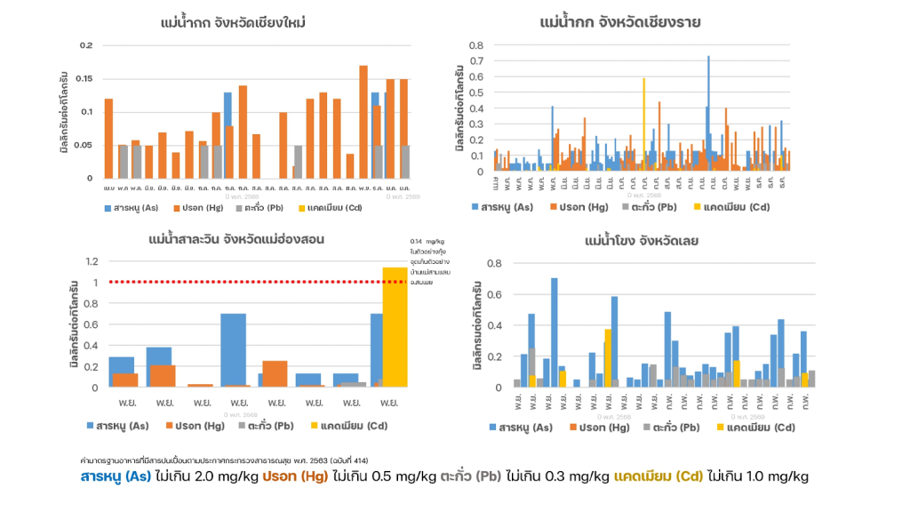 ผลการตรวจในช่วงปี 2568 ถึงต้นปี 2569 พบว่า ปลาในทุกลุ่มน้ำมีการปนเปื้อนของสารหนู ตะกั่ว แคดเมียม และปรอทในระดับหนึ่ง