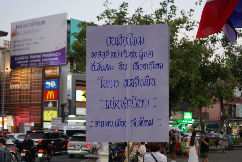 24 ธันวาคม 2568 เวลา 17.00 น. ชาวเชียงใหม่กลุ่มหนึ่งรวมตัวจัดกิจกรรมแสดงจุดยืน “ต่อต้านสงคราม ไทย–กัมพูชา” บริเวณหน้ามหาวิทยาลัยเชียงใหม่ โดยผู้ร่วมกิจกรรมยืนชูป้ายข้อความแสดงเจตนารมณ์อย่างชัดเจน อาทิ “ไม่เอาสงคราม หยุดหลอกไพร่ไปตาย” “วิธีแบบตาต่อตา มีแต่จะทำให้เรามืดบอด” และ “ถามชายแดนมาแล้ว อยากให้หยุดรบก็เยอะ”