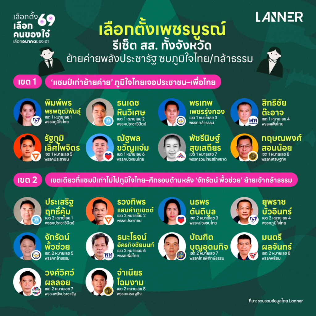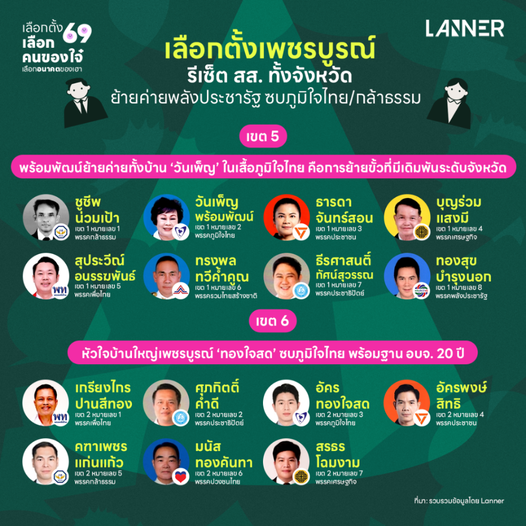 การเลือกตั้ง สส. จังหวัดเพชรบูรณ์มีทั้งหมด 6 เขตเลือกตั้ง และผู้สมัคร 52 คน (เขต 1 = 8, เขต 2 = 10, เขต 3 = 8, เขต 4 = 11, เขต 5 = 8, เขต 6 = 7) รอบนี้เป็นตัวอย่างชัดของ ‘การเมืองแบบบ้านใหญ่’ ที่เปลี่ยนสมการทั้งจังหวัดด้วยการย้ายพรรค โดยแชมป์เก่าทั้ง 6 เขตลงต่อครบทุกพื้นที่ และพร้อมใจกันย้ายออกจากพรรคพลังประชารัฐซึ่งเคยเป็นเรือลำเดิมในการเลือกตั้งปี 2562–2566 แทบทั้งจังหวัด โดยที่อดีตแชมป์เก่าเขต 2 ย้ายไปพรรคกล้าธรรม ขณะที่อีก 5 เขตไหลเข้าไปอยู่ภูมิใจไทยทั้งหมด