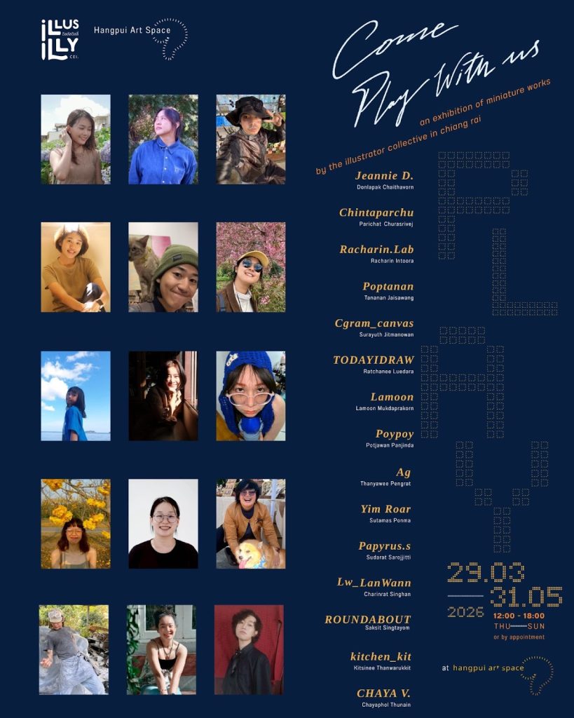 เชียงรายยังคงขยับตัวอย่างต่อเนื่องในฐานะเมืองศิลปะร่วมสมัย และในจังหวะเดียวกันนั้น พื้นที่ขนาดเล็กอย่าง Hangpui Art Space (หางปุย อาร์ตสเปซ) ก็กำลังเปิดพื้นที่ให้กับความเคลื่อนไหวของศิลปินรุ่นใหม่ผ่านนิทรรศการ Come Play with Us โดยกลุ่มศิลปินภาพประกอบ Illus Illy ซึ่งจะเปิดงานในวันที่ 29 มีนาคม 2569 เวลา 16.00 น. และจัดแสดงต่อเนื่องถึงวันที่ 31 พฤษภาคม 2569