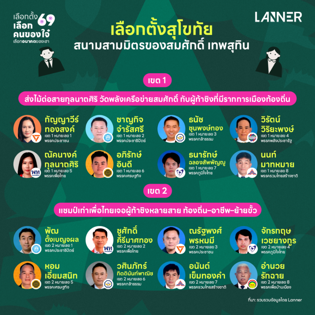 หากพูดถึงจังหวัดสุโขทัยต้องเริ่มจากชื่อของ สมศักดิ์ เทพสุทิน และเครือข่าย ‘กลุ่มสามมิตร’ ที่เป็นแกนกลางของโครงสร้างการเมืองของจังหวัดมาช้านาน เพราะสุโขทัยไม่ได้แข่งขันกันด้วยแบรนด์พรรคเพียงอย่างเดียว แต่เป็นจังหวัดที่พลังของเพื่อไทยจำนวนมากในพื้นที่ยึดโยงอยู่กับเครือข่ายนำทางการเมืองที่มี สมศักดิ์เป็นคนวางฐาน วางคน และรักษากลไกทางอำนาจไว้อย่างต่อเนื่อง ดังนั้น ยิ่งสมศักดิ์ถูกจับตาในบทบาทระดับชาติของพรรคเพื่อไทยมากเท่าไหร่ สุโขทัยก็ยิ่งถูกยกเป็นจังหวัดยุทธศาสตร์ที่ ‘ห้ามเสีย’ และต้องชนะให้เห็นความแข็งแรงของเครือข่ายเดิมมากเท่านั้น