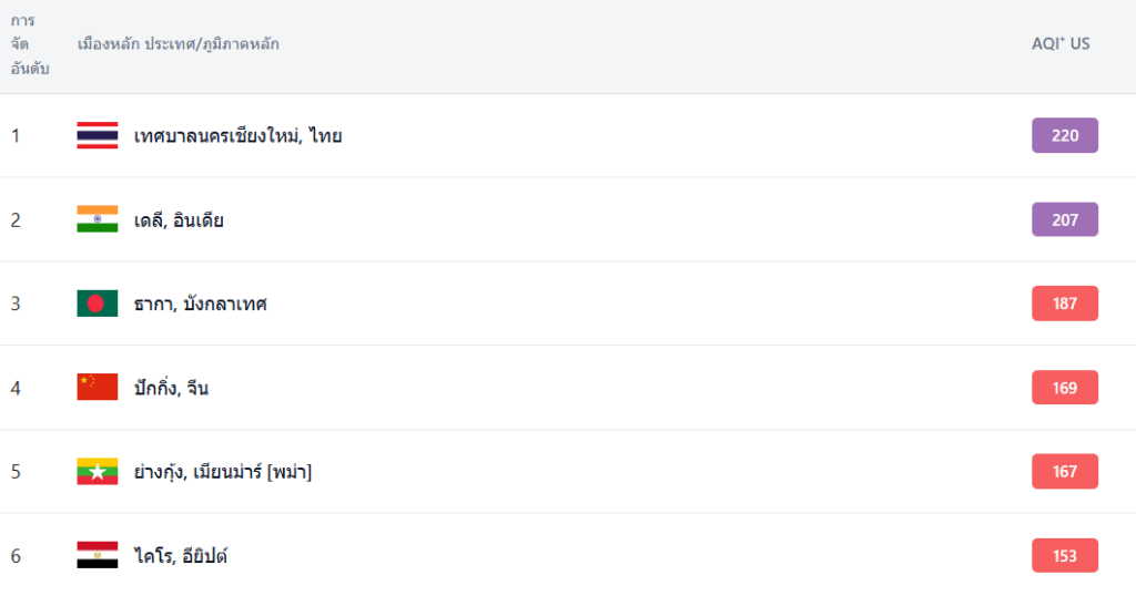 ขณะที่เว็บไซต์ Iqair.com ซึ่งรายงานคุณภาพอากาศจากทั่วโลก แจ้งผลการตรวจวัดคุณภาพอากาศและการจัดอันดับเมืองที่มีมลพิษ เมื่อเวลา 09.00-10.00 น. พบว่าเทศบาลนครเชียงใหม่มีดัชนีคุณภาพอากาศอยู่ที่ 220 US AQI โดยถือเป็นอันดับ 1 ของเมืองหลักที่มีมลพิษอากาศสูงสุดของโลก