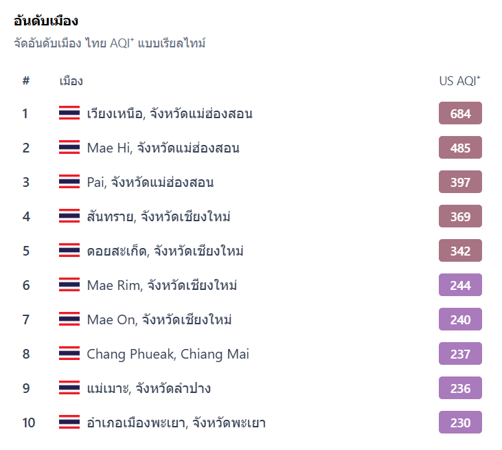 เว็บไซต์เดียวกันนี้ ยังรายงานค่า PM 2.5 ที่วัดได้ในหลายหลายพื้นที่ของจังหวัดภาคเหนือ โดยพบตัวเลขที่น่าตกใจว่า จังหวัดแม่ฮ่องสอน มีค่า PM 2.5 ที่วัดได้สูงถึง 684 µg/m³ ทั้งยังมีจังหวัดลำปางและพะเยา ที่ติดอันดับเมืองที่มีค่า PM 2.5 ที่วัดได้มากที่สุด 10 อันดับแรกของประเทศ
