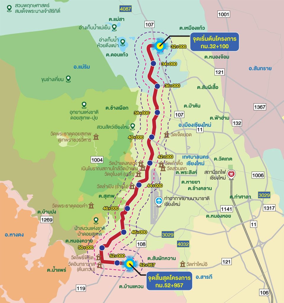 - ปรับปรุงทางแยก 3 ช่วงหลัก ได้แก่ แยกกองพันพัฒนา – ศูนย์ประชุมนานาชาติ, ช่วงเจ็ดยอด–ช่างเคี่ยน–วัดอุโมงค์ และช่วงสุเทพ–ราชพฤกษ์