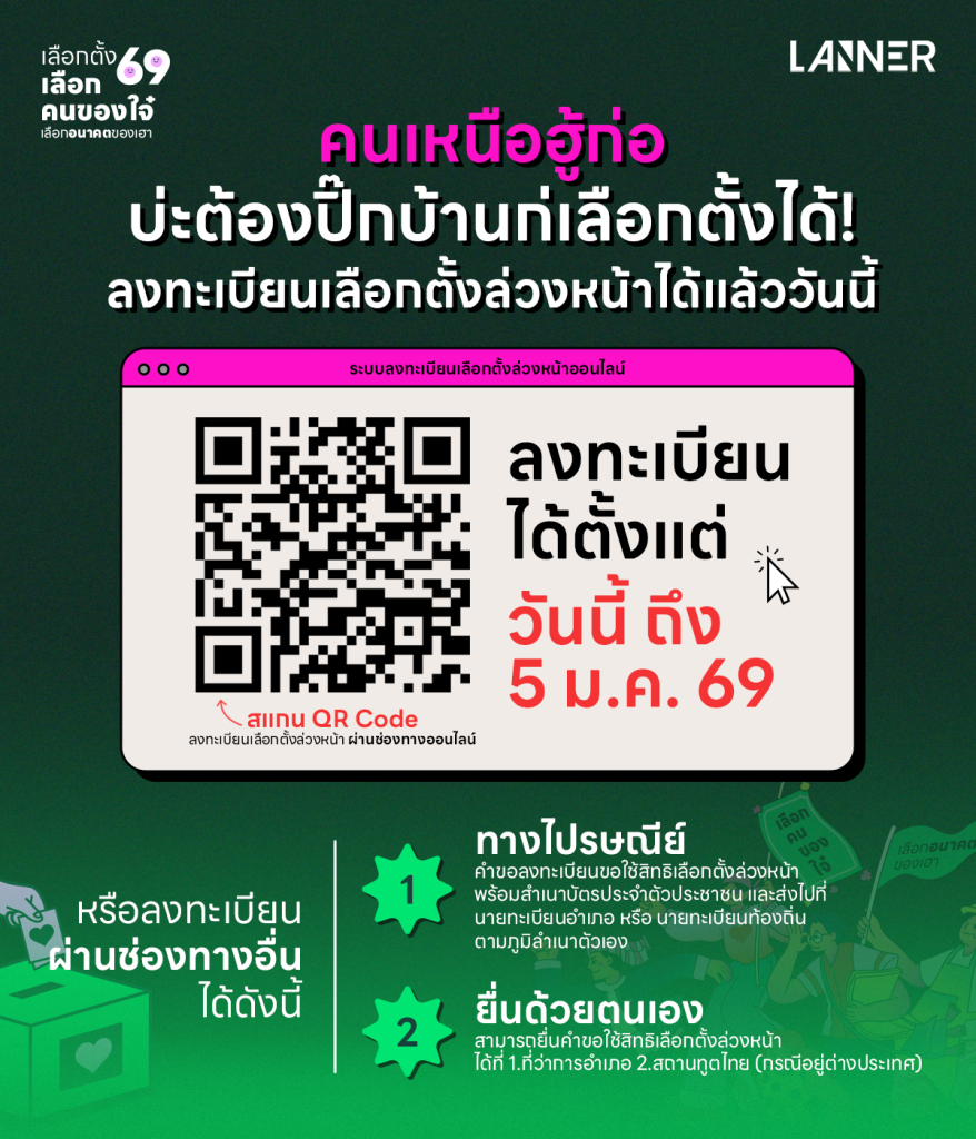 3. ยื่นคําขอออนไลน์ผ่านเว็บไซต์ของ กกต. (เฉพาะการเลือกตั้งล่วงหน้า ณ ที่เลือกตั้งกลางนอกเขตเลือกตั้ง และการเลือกตั้งนอกราชอาณาจักร) ซึ่งสามารถทำได้ตลอด 24 ชั่วโมง จนกว่าระบบจะปิดอัตโนมัติ ในวันที่ 5 มกราคม 2569 เวลา 24.00 น. ตามเวลาประเทศไทย